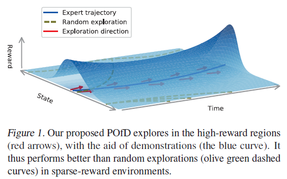To address this problem, we propose to combine the above two ideas by developing a principled method that rewards demonstration-like actions more during interaction with environments, which thus encourages exploration for meaningful states when feedback is sparse. The intuition is that, when the reward signal is not available, the agent should mimic the demonstrated behavior in the early learning stages for exploration. After acquiring sufficient skills, the agent can explore new states on its own. This is actually a dynamic intrinsic reward mechanism that can be introduced for reshaping native rewards in RL. We realize our idea with three technical novelties. 1) We reformulate the policy optimization objective by adding a demonstration-guided exploration term, which measures the divergence between the current policy and the expert one, forcing expert-alike exploration. 2) We convert the proposed objective to a new one defined on occupancy measure (Ho & Ermon, 2016) for better exploiting demonstrations and establish an optimization-friendly lower bound. 3) We eventually draw a connection between optimizing the derived lower bound and generative adversarial training (Goodfellow et al., 2014), and show that the optimization can thus easily proceed in a manner of alternating between two sub-procedures. One is fitting a discriminator measuring the similarity between expert data and self-generated data to reshape the reward; the other one is updating the policy with the gradient from the reshaped reward function. POfD is general and compatible with most policy gradient methods. We also show that existing replay memory-based learning from demonstration methods (Hester et al., 2017; Vecerık et al., 2017) can be interpreted as degenerated cases of our method in terms of how to leverage the demonstration data.