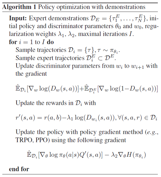 where $r^{\prime}(s, a)=r(a, b)-\lambda_{1} \log \left(D_{w}(s, a)\right)$ is the reshaped reward function. This function augments the environment reward with demonstration information. When the environment feedback is sparse or exploration is insufficient, the augmented reward can force the policy to generate similar trajectories as the expert policy $\pi_{E} .$ In other words, the divergence of $\pi$ and $\pi_{E}$ is minimized. Therefore, our algorithm is able to explore the environment more efficiently. The above objective can be optimized efficiently by alternately updating policy parameters $\theta$ and discriminator parameters $w .$ First, trajectories are sampled by executing the current policy $\pi_{\theta}$ and mixed with demonstration data to train the discriminator by SGD. The gradient is given by,