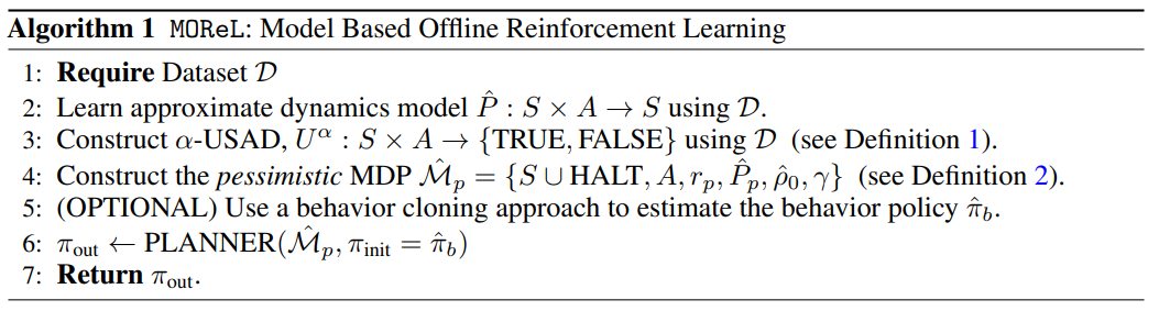The principal contribution of our work is the development of MOReL (Model-based Offline Reinforcement Learning), a novel model-based framework for offline RL (see figure 1 for an overview). MOReL consists of two modular steps: (a) learning a pessimistic MDP (P-MDP) using the offline dataset, and (b) learning a near-optimal policy for the P-MDP. For any policy, the performance in the true MDP (environment) is approximately lower bounded by the performance in the P-MDP, making it a suitable surrogate for purposes of policy evaluation and learning. This also guards against model exploitation, which often plagues MBRL. The P-MDP partitions the state space into “known” and “unknown” regions, and uses a large negative reward for unknown regions. This provides a regularizing effect during policy learning by heavily penalizing policies that visit unknown states. Such a regularization in the space of state visitations, afforded by a model-based approach, is particularly well suited for offline RL. In contrast, model-free algorithms [16, 18] are forced to regularize the policies directed towards the data logging policy, which can be overly conservative. Theoretically, we establish upper bounds for the sub-optimality of a policy learned with MOReL and a lower bound for the sub-optimality of a policy learnable by any offline RL algorithm. We find that these bounds match up to log factors, suggesting that MOReL is nearly minimax optimal.