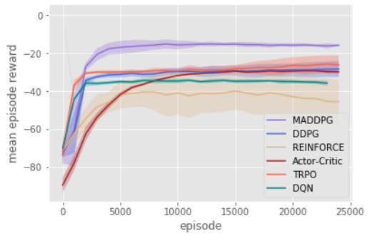 We first examine the cooperative communication scenario. Despite the simplicity of the task (the speaker only needs to learn to output its observation), traditional RL methods such as DQN, Actor-Critic, the first-order implementation of TRPO, and DDPG all fail to learn the correct behavior (measured by whether the listener is within a short distance from the target landmark). In practice, we observed that the listener learns to ignore the speaker and simply moves to the middle of all observed landmarks. We plot the learning curves over 25000 episodes for various approaches in Figure 4.